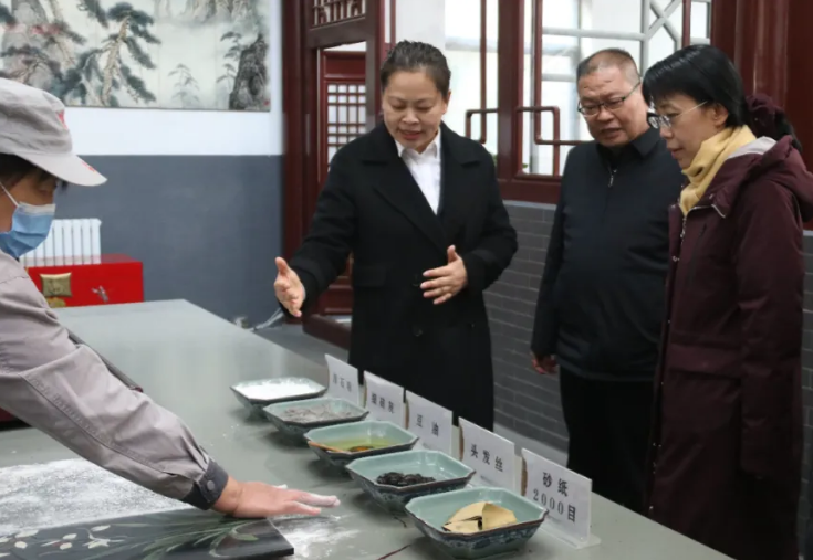在調(diào)研過程中,趙紅嚴(yán)副省長詳細(xì)聽取了平遙唐都推光漆器有限公司關(guān)于大師工作室的日常運作、人才培養(yǎng)、技術(shù)創(chuàng)新以及產(chǎn)品市場推廣等方面的匯報。深入了解了平遙推光漆器這一傳統(tǒng)手工藝的歷史淵源、制作技藝以及文化價值,并對企業(yè)在傳承與創(chuàng)新方面所取得的成就給予了高度評價。趙紅嚴(yán)副省長指出,平遙推光漆器作為*********非物質(zhì)文化遺產(chǎn),承載著豐富的歷史文化內(nèi)涵,我們要保護(hù)好、傳承好。她強調(diào),要進(jìn)一步加強大師工作室的建設(shè)與管理,充分發(fā)揮其在傳統(tǒng)工藝傳承與創(chuàng)新中的核心作用,培養(yǎng)更多******的手工藝人才,推動傳統(tǒng)工藝與現(xiàn)代設(shè)計相結(jié)合,不斷提升產(chǎn)品的市場競爭力。