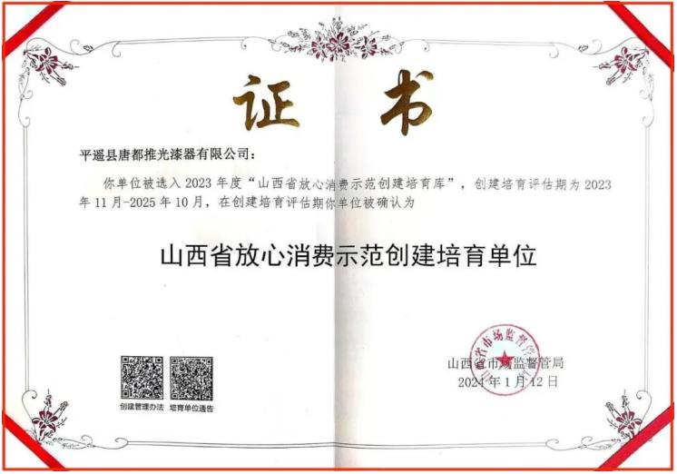平遙煤化集團(tuán)唐都推光漆器公司作為平遙縣推光漆器的代表,始終秉承傳統(tǒng)工藝與現(xiàn)代理念相結(jié)合的發(fā)展理念,堅(jiān)持為消費(fèi)者提供高品質(zhì)的產(chǎn)品和高質(zhì)量的服務(wù)。此次榮獲“山西省放心消費(fèi)示范創(chuàng)建培育單位”榮譽(yù)稱號,不僅是上級管理部門對唐都公司長期以來堅(jiān)持“誠信經(jīng)營、質(zhì)量至上”服務(wù)理念的充分認(rèn)可,更是對企業(yè)持續(xù)推動消費(fèi)環(huán)境改善,保護(hù)消費(fèi)者權(quán)益等工作的高度肯定。